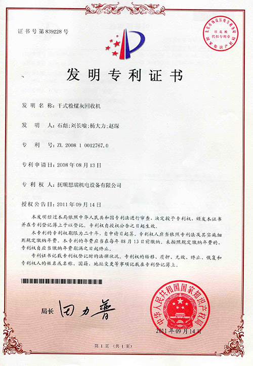 我公司粉煤灰回收機(jī)獲國(guó)家發(fā)明專利證書、實(shí)用新型專利證書